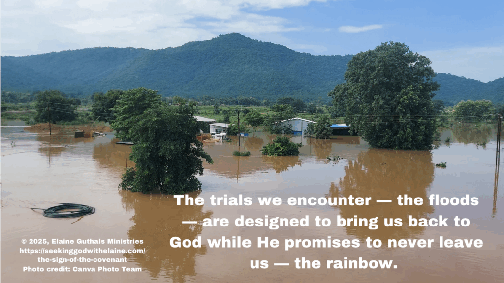 The trials we encounter — the floods — are designed to bring us back to God while He promises to never leave us — the rainbow. Even in our darkest trials, God will be right there with us.